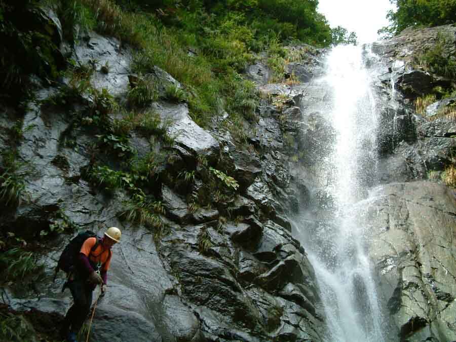 この大滝の少し先で谷は狭まりだし、直登不能の釜を持つ2段の滝が現れる。右岸に残置があり過去に攻めている形跡が見られるが、ここは巻くのが定石のルートといえる。