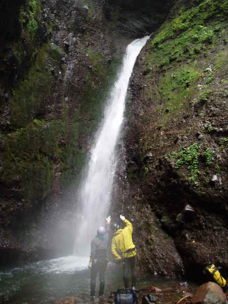 し、最後の12m直瀑に行く手をふさがれる。流水の右側を高田さんが何度かトライし