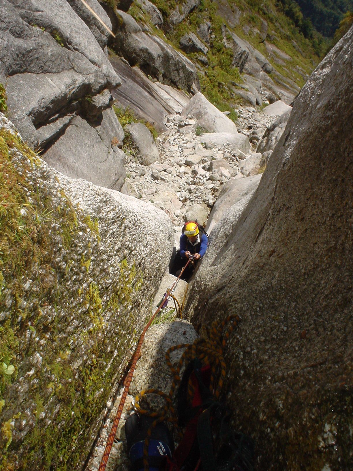 フランス人のチムニーは鮎島がリード。もちろん、フランス人の足の長さじゃないとオポジションできないワイドチムニーは足の長さが足りないので、その左のクラックから登るわけだが、これもかなり悪い。出だしはショルダーであとはずりずり上がる。ようやく残置ハーケンまで辿りついた(ここまで5.8くらい?)と思ったらここからが核心。CSがあってフリーでは無理っぽい。なんか風化しているようなCSに黄エイリアンをかけてアブミにのりこんだら、やっぱり外れて5m落下。肘を打った以外は怪我はなかったが自信喪失し太田さんにバトンタッチ。サクッとキャメ0.5を決めて登っいた。私は簡単にユマーリング。