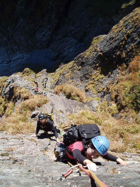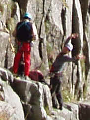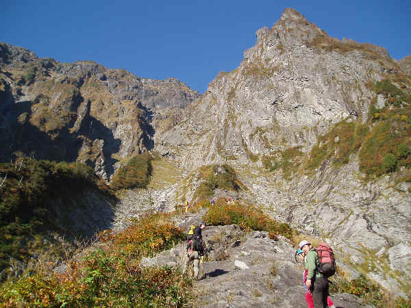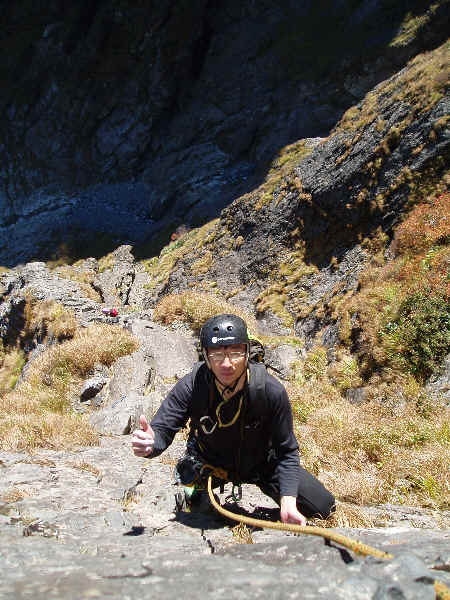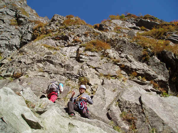 凹状岩壁取り付きにて。ここで高橋さん・寺本さんはここから出発。