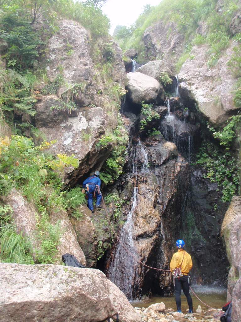 沢床に降りると、巨大な側壁を持つ左股がガビーンと奥へ続いており、我々の進路である右股もこれまた10m滝がガビーンと立ちふさがり登攀不可能。これらの光景は懸垂地点からも見えるので、懸垂前、トーマスさんは「あんなん上れないからこのまま巻いちゃおうぜ」なんて言っていたが、この夏それでひどい目にあったでしょう!こういう場合はとりあえず降りてみるもんだ。