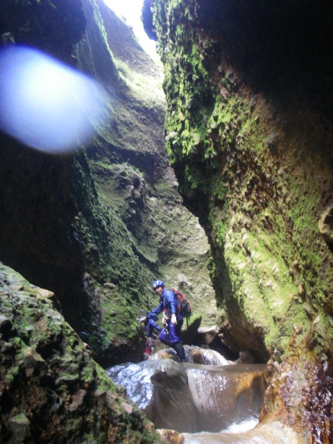 。「ヘッドランプが欲しい〜」という程度の暗さである。上を見上げると少しの隙間からしか青空が望めない・・・。おそらく、今まで行った中では一番の井戸底ゴルジュの真っ最中にある。