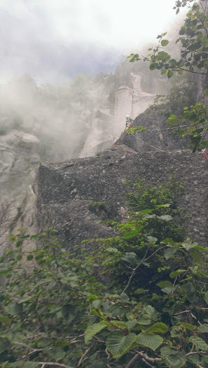 左/見下ろす2P目のジェードル。ジェードルに入って視野に飛び込む上部は背景と重なり日本離れした雰囲気だが登攀中撮れず残念。