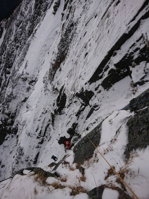 〇11ピッチ目:城塞ハングのチムニーを登る。夏と打って変わって非常に難しい。チムニーが終わると雪壁になり終了点のテラスに出る。Ⅳ+、50m。