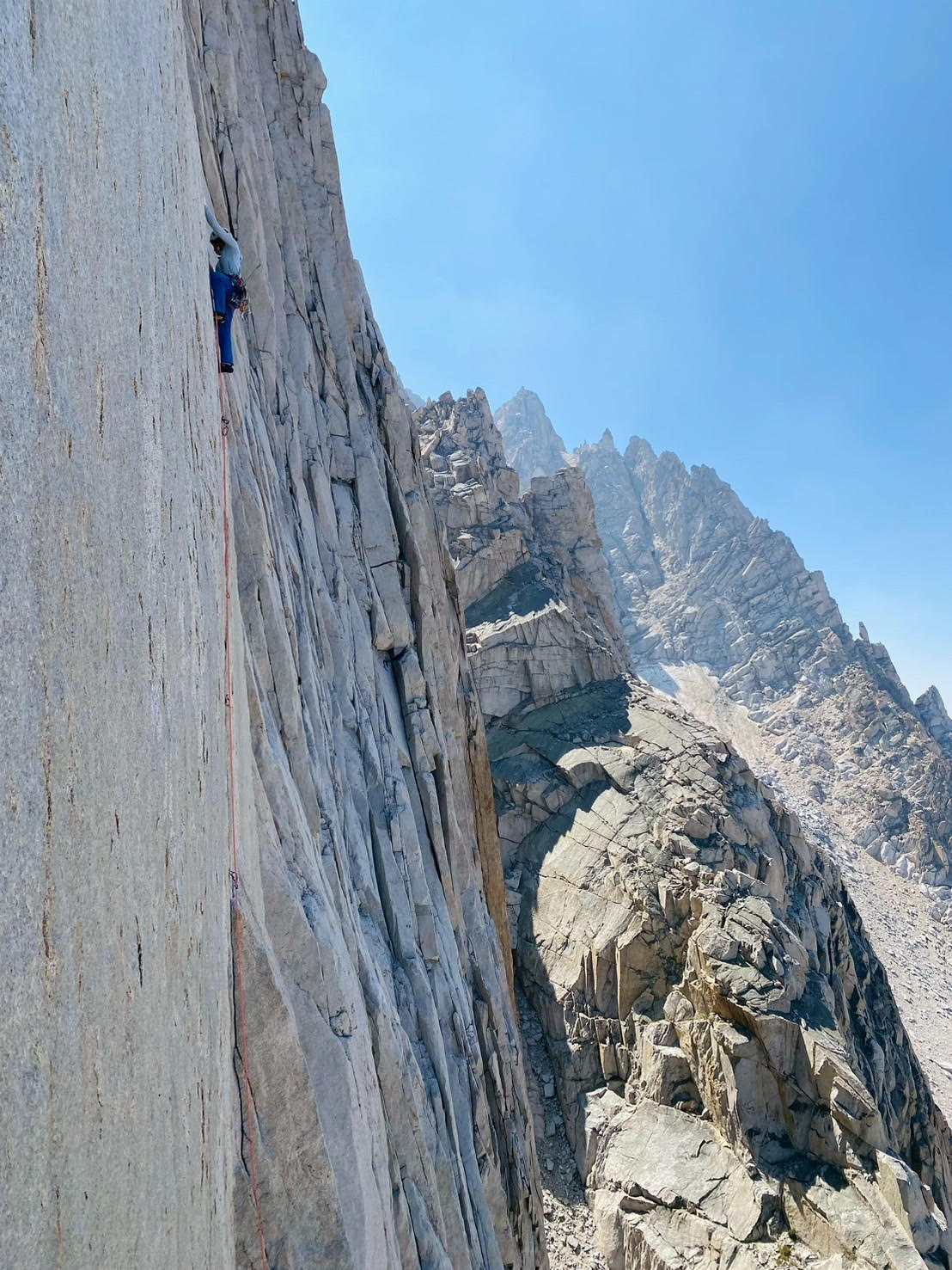 最初のピッチはまだ濡れており、エイドで抜ける。一昨日登れて良かった。次の10aを越え、右側の11dを登る。カムが効かないフレアセクションがあり、緊張感があった。4ピッチ目、核心のBook of Secrets。その名の通り本を開いたような凹角。序盤はダイクが水平に何本か走っており登りやすいが、後半になるにつれ散らばった結晶を拾うようになり、それがどんどん少なくなってくる。凹角が茶色いこともあり、文字が消えかかった古文書を読み解くよう。ステミング、レイバックでジリジリと高度を上げる、おそらく3カ所ある核心の最後の結晶1つを見逃し、足が滑ってフォール。あと3ムーブだった。