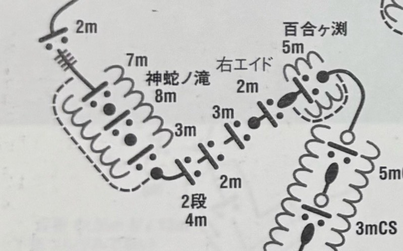 今回登った百合ヶ渕も神蛇ノ滝も巻いている。下山後調べると百合ヶ渕と神蛇ノ滝中段8mは巻いたが奥の7m滝を登攀しているパーティーの記録あり。奥の7m滝は我々も探ったが大きめのカムが必要で次回持ち越しとしていた。