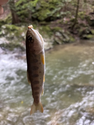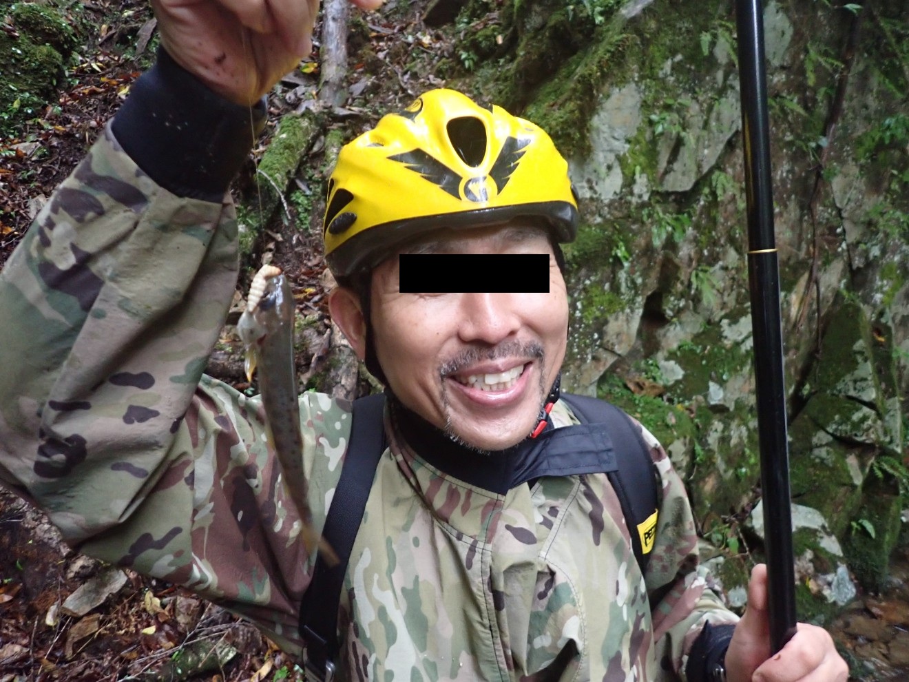 途中死にかけのぶどう虫を餌に釣り竿を出した所、篤さん見事ヒット!人生で初めて釣れたそうです。小柄ですが模様の綺麗なイワナでした。忘れられない沢になったことでしょう。
