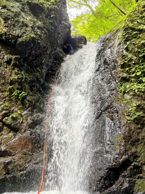 曲がりの滝は水量多いもののロープを出して直登チャレンジ!治田さんに頂いたエイリアンがバチ決まりでした。その後も簡単に巻くことができるような滝をフリーで積極的に登り、なんだかんだ充実。プチゴルジュのチムニーをバックアンドフットでずり上がるのがハイライトでした。