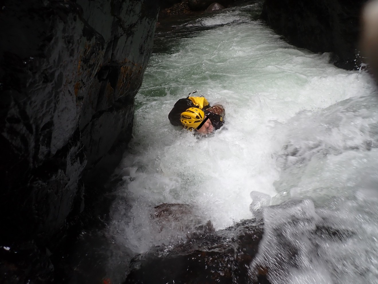 ゴルジュ出口の10m滝。巨岩の奥にジャミングを決めて意を決して水流に足を突っ込むのが核心。