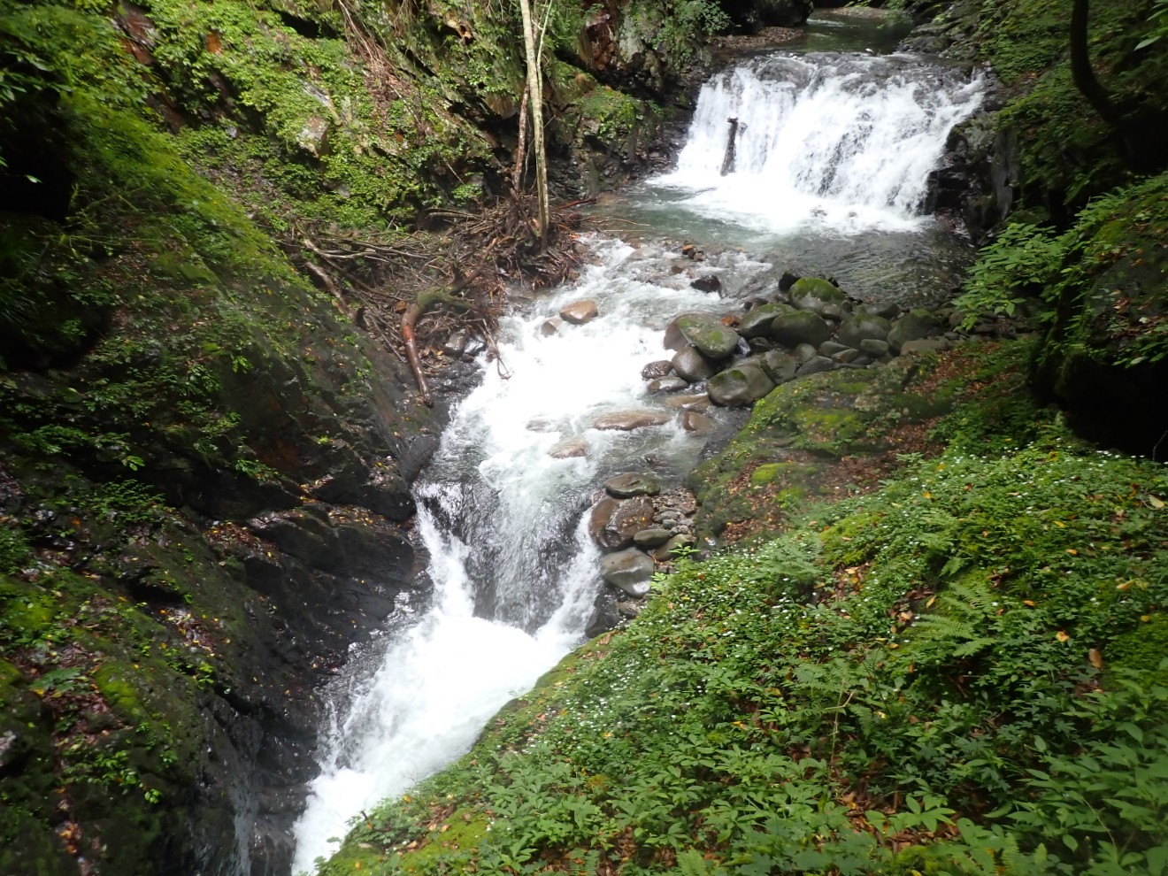 核心部は一カ所、ナイアガラの滝の手前のゴルジュのみ。泳ぎ、ハンマー投げ、へつりと色々試しましたが水流強く断念。高巻きました。高巻きもロープがあるものの、悪そうだったのでビレイ。ナイアガラの滝を越えたあたりの支流を使って林道に上がり脱渓しました。