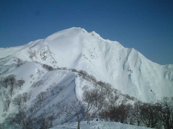 頂上で休んでいると1人稜線からマチガ沢へ滑り込んでいった。