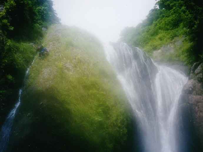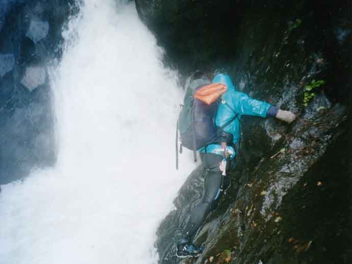 40m大滝は左のカンテから左流水で直登。60m大滝も迫力。その上のナメ