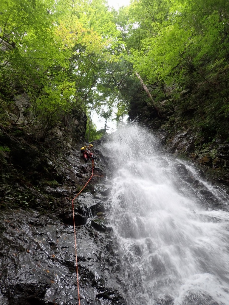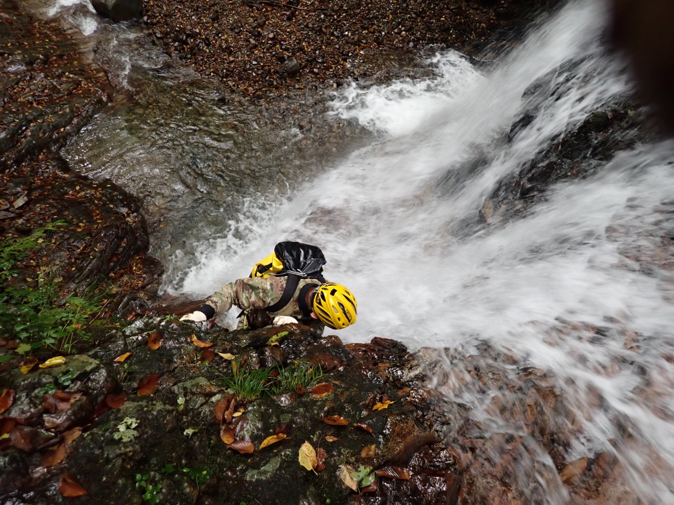核心部は一カ所、ナイアガラの滝の手前のゴルジュのみ。泳ぎ、ハンマー投げ、へつりと色々試しましたが水流強く断念。高巻きました。高巻きもロープがあるものの、悪そうだったのでビレイ。ナイアガラの滝を越えたあたりの支流を使って林道に上がり脱渓しました。