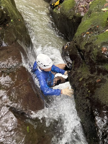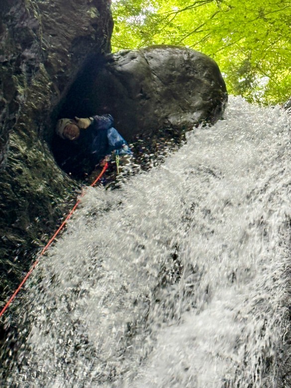 ゴルジュ出口の10m滝。巨岩の奥にジャミングを決めて意を決して水流に足を突っ込むのが核心。
