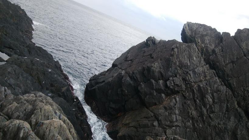 バスで尾之間で降りるが、どうにも海岸への道はない。浜はなく絶壁であり岩礁だ。谷崎鼻という灯台のある手前の左踏跡を探り、岩を降りていく。波に打たれた岩は怖いが、手ですくい海水を味わう。