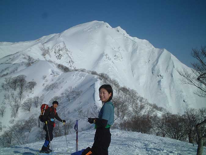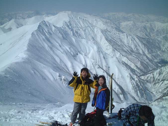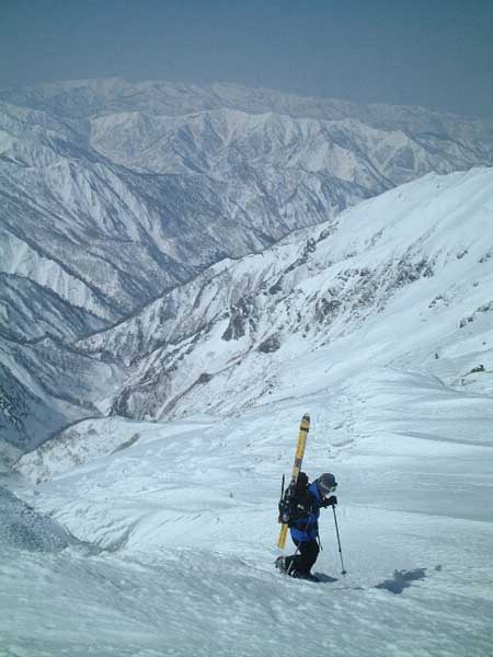 頂上で休んでいると1人稜線からマチガ沢へ滑り込んでいった。